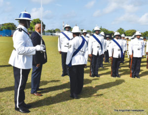 The Honourable Chief Minister, Mr. Victor Banks, who inspected the Parade, and Her Excellency the Governor, Christina Scott, who accompanied him on the decorated podium, took the Royal Salute during the march past. Mr. Banks was accompanied on the inspection tour by the Commanding Officer, Acting Inspector Brian Best, Acting Commissioner of Police, Elliott Forbes; and Contingent Leaders.