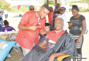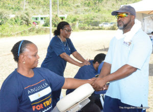 “At the first tent the Anguilla Red Cross is checking everyone’s vitals – blood sugar, blood pressure and conditions like that. At the second tent, we have doctors on staff meeting with everyone who can ask questions about their health. At the third tent, we have a Dentist and an Eye Doctor checking everyone’s teeth and eyes. The massage tent is giving free neck, shoulder and back massages. We have free lunch; fitness classes throughout the day. So we have had yoga classes and a stretch class; there is a barber giving free haircuts at the back tent; a foot-care tent where free pedicures are being given; and we are also having raffle prizes all day long and free gifts for everyone. There is a also a bouncing castle for kids.”