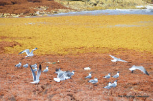 There have been some commendable attempts, especially at Sandy Hill Beach, by villagers, to remove the huge pile-up of seaweed which gives the appearance of a wide, but irregular, brown pasture covering the inshore waters. With the probability of trapped dead fish and other marine life, the dense waste has become a habitat for clusters of birds.