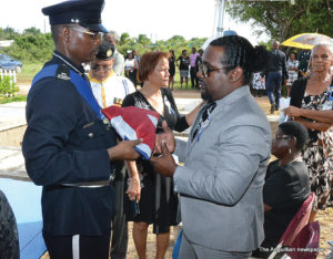 The National Funeral procession, with the Official Flag of Anguilla draping the mahogany casket, wended its way to the Sandy Hill Cemetery where the Police Firing Party discharged a gun salute in honour of Mr. Rogers. The flag from the casket was presented to Mr. Rogers’ son, Sheldon Rogers, by Sergeant Delvin Fleming on behalf of the Government and people of Anguilla.