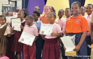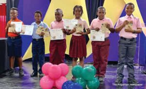 The prizes and awards were issued to the students by Mr. Kerith Kentish of the Anguilla Bar Association. In grades 3 to 4, 1st prize went to Adiaiah Linton; 2nd to Asante Mkobe; and 3rd to Dwight Benjamin — all three students of the Orealia Kelly Primary School.