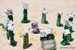 At present, there are piles of collected seaweed at Sandy Hill Bay, some of which Mr. Mueller, a native of Wisconsin, assisted in raking up from the beach. Now that he left Anguilla on Thursday, this week, he has also left behind various effigies of the Easter Season which he constructed to adorn the beach.