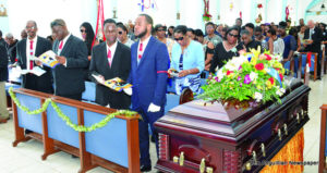 The spoken tributes began at the “Wake”at Ebenezer Methodist Chapel on the evening of Friday, December 27, and continued the next morning at St. Mary’s Pro-Cathedral before and during the Thanksgiving Service. In a recorded tribute there, from the United States, Premier Victor Banks, said in part: