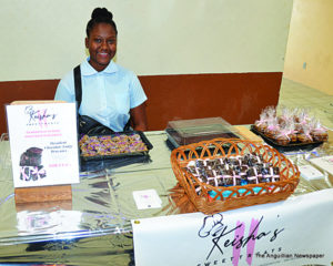 We then visited a stall that specializes in tasty sweet treats. The young entrepreneur there gave us a cordial welcome. She said: “My name is Keisha Edwards and I own Keisha’s Sweet Treats. I feature a wide range of sweets including decadent chocolate, fudge brownies, chocolate chip cookies, and healthy granola bars. Everyone who tries these granola bars really likes them. I was eighteen years old when I started this business. My mom and dad support me in it, but I work with the school, and whatever I make I invest into my delicacies ‘cause I am determined to see my business grow.”