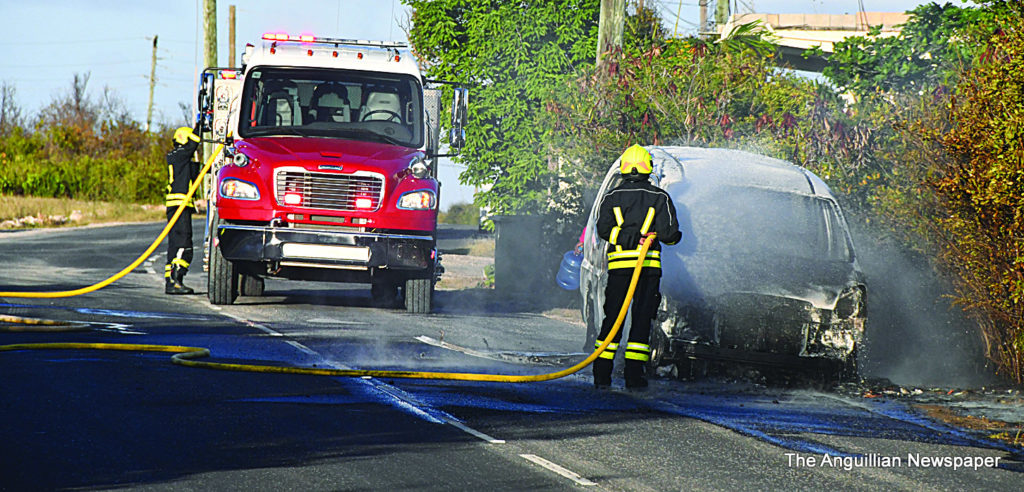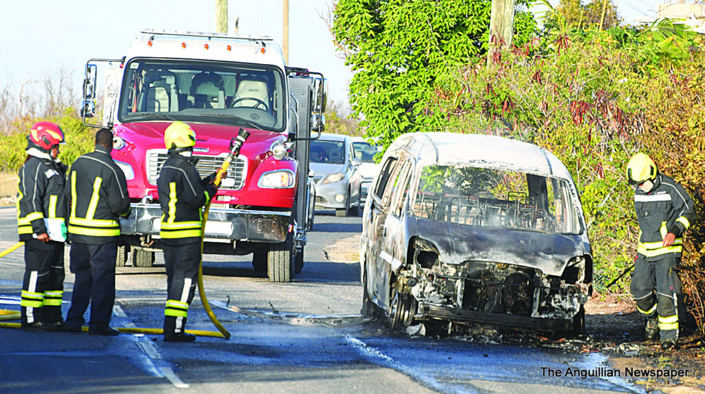 For almost two hours a burning vehicle blocked the flow of traffic on the Long Path, on Sunday, March 28, 2021. The fire, which completely destroyed the parked bus, was put out by members of the Anguilla Fire and Rescue Service. The origin of the fire was not immediately known.