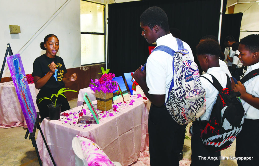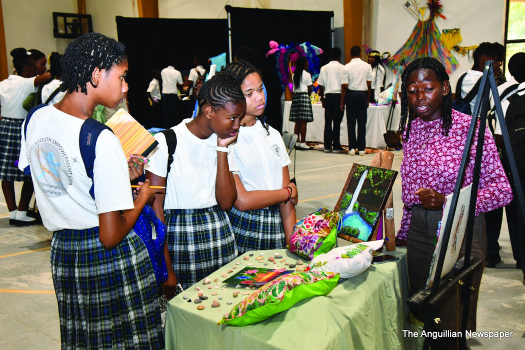 Head of the school’s Visual Arts Department, Navine Mairyshaw, told The Anguillian newspaper: “We are having our Seventh Visual Arts Exhibition in which the students in Fifth Form completed their CXC SBAs for marking and their exhibits are now on display. We have a variety of paintings, textiles, sculptures, graphic designs and each student has his or her own theme to showcase their work. The teacher associated with the students is Alaina Carty.”