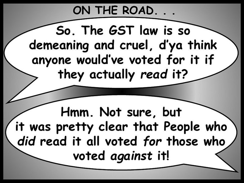 And while we await promised relief – we remain vulnerable to any future administration reinstating the full, grotesque, immoral and undemocratic rot in this bill. You know. With a single vote in the House, not unlike that single vote at the polls, where the People voted for those who voted against GST.