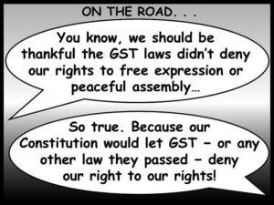 Whereas our constitution allows future laws to limit such rights, like our first and second GST laws. They allow for searches without warrants, to being forced to testify against oneself, and take an oath against one’s will.[2] Fortunately, GST laws did not forbid our freedom of speech or the press to report on how GST was passed, despite our petitions – or the GST march.[3] But where would we be if they had?